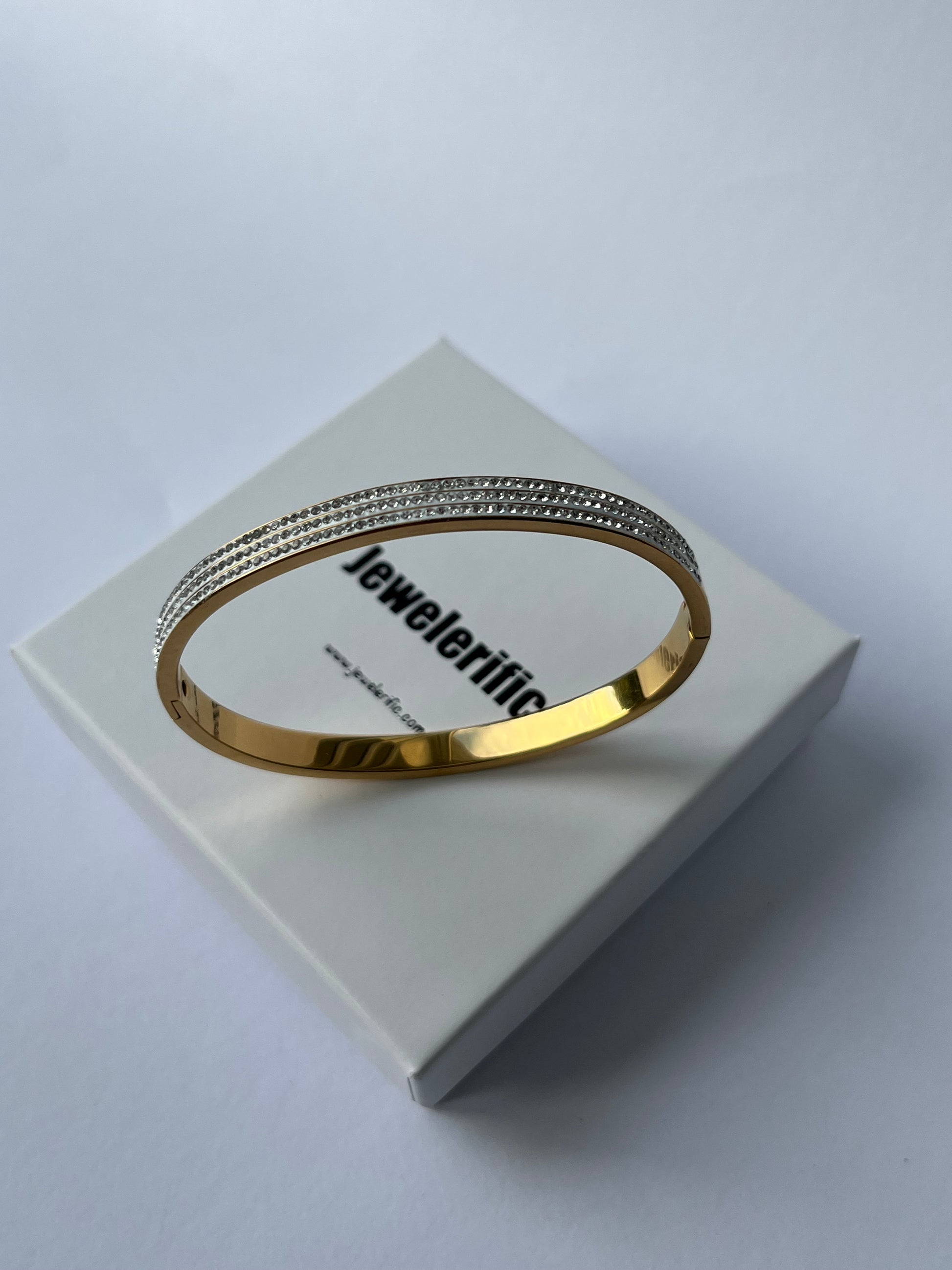 From our Gold Collection we love this gold bangle bracelet with 3 lines of cubic zirconia adding a touch of sparkle to any outfit.