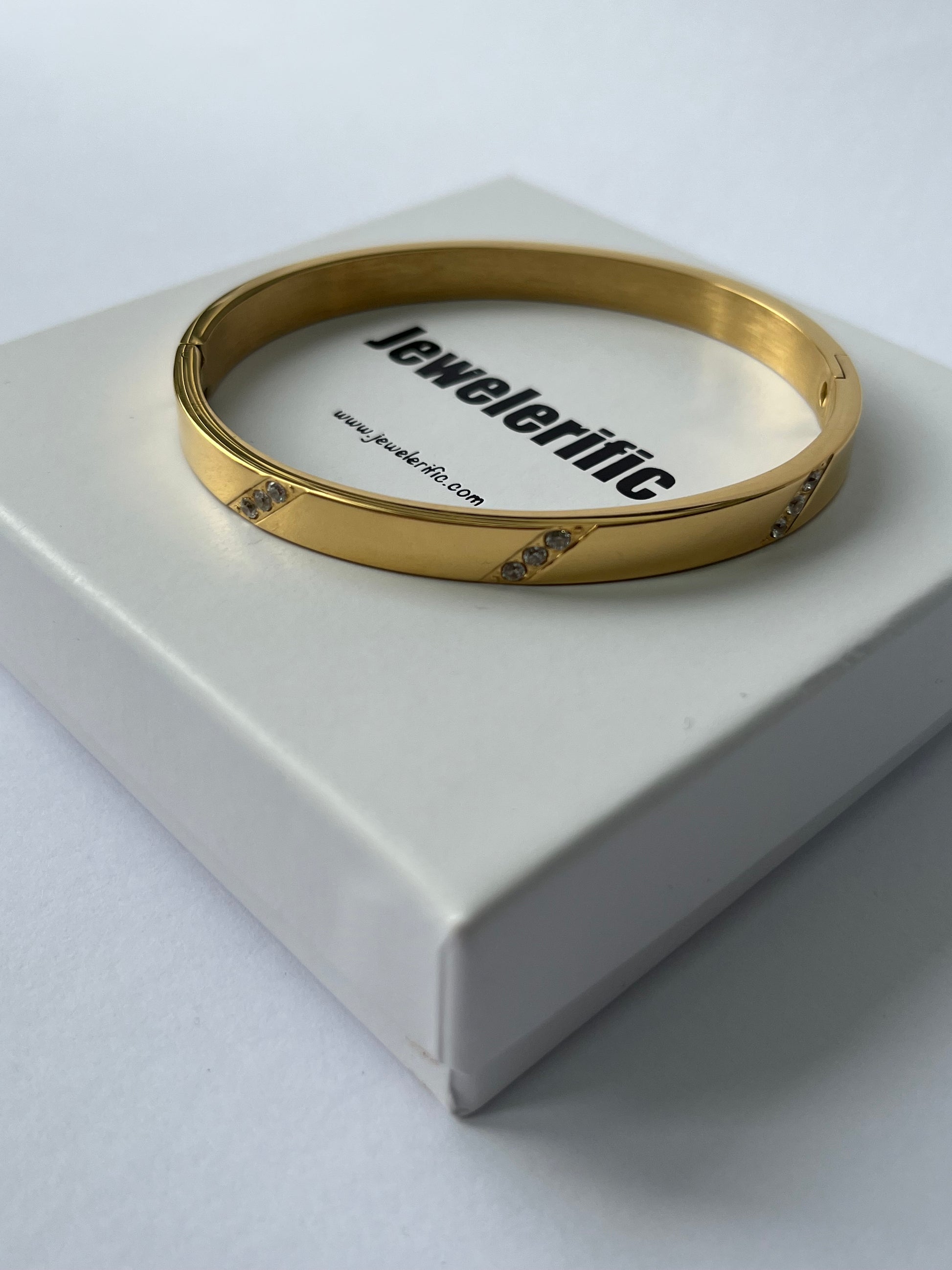 From our Gold Collection we love this gold bangle bracelet with 3 inserts of cubic zirconia adding a touch of sparkle to any outfit.